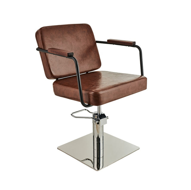 Ayala Enzo 01 – Scaun profesional de coafor maro cu bază rotundă cromată – Stil industrial rafinat și confort suprem pentru saloanele moderne
