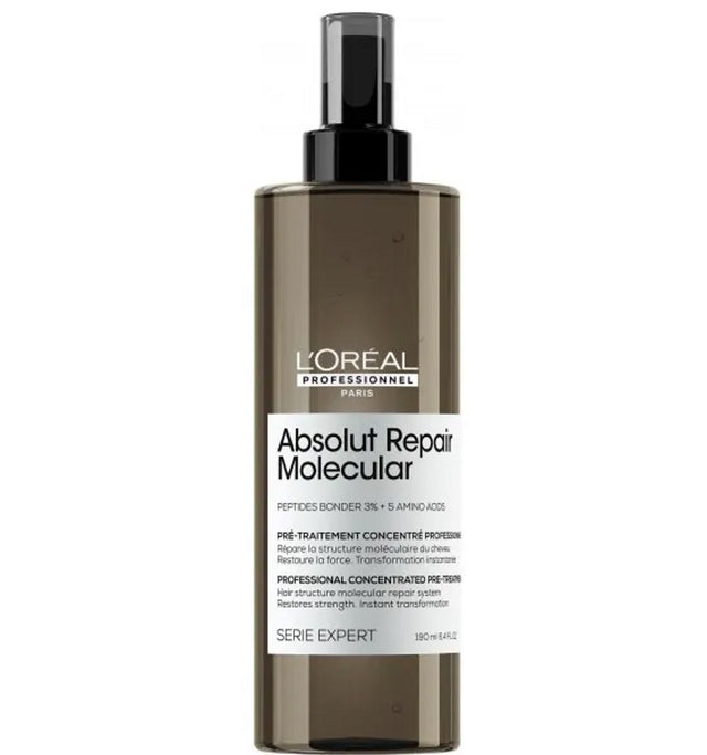 L'Oreal Professionnel Serie Expert Absolut Repair Molecular Pre-Treatment este soluția avansată pentru repararea părului deteriorat, menținând rezultatele de salon acasă. Special conceput pentru a pregăti părul să absoarbă în mod optim tratamentele ulterioare, acest pre-tratament pătrunde profund în fibra capilară pentru a repara eficient daunele acumulate în doi ani, chiar după o singură aplicare. Formula îmbogățită cu tehnologie moleculară de ultimă oră și un amestec senzual de note de bergamotă, mandarină, mimoză, frezie și mosc alb, oferă părului tău un parfum rafinat. Cu 3% Peptide Bonder și 5 aminoacizi, tratamentul fortifică fiecare fir de păr, redându-i vitalitatea, elasticitatea și strălucirea naturală.